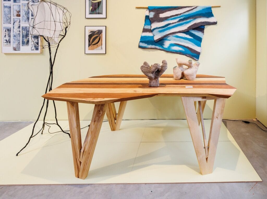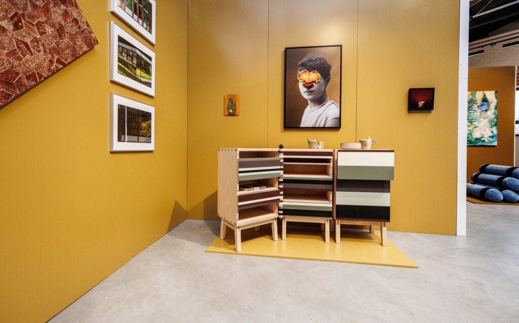 De expositie brengt uiteenlopende disciplines samen. Je bekijkt ambachtelijk gemaakte meubels, interieurstukken en collecties van ontwerplabels. Daarnaast stuit je op fotografie, pentekeningen, textiele werken en ruimtelijke installaties. Ontwerper en stylist Irene van Ophoven gaf de expositie vorm en selecteerde de meubelmakers. De selectie van kunstwerken stelde zij samen met curator Maarten Schepers.